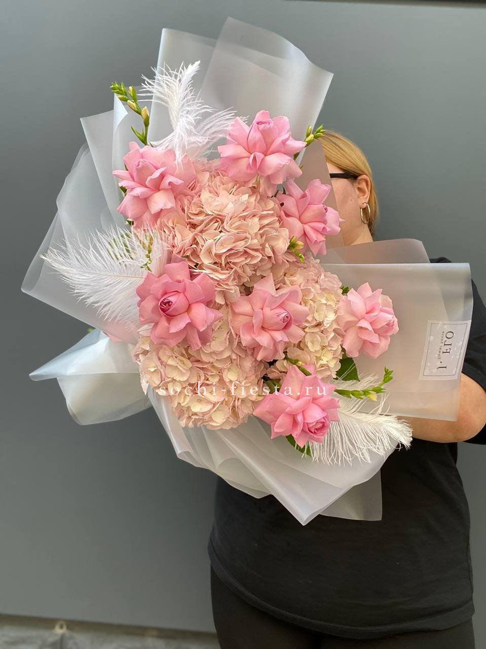 Для заказа товара " Букет из гортензий и розовых роз" с доставкой в Магнитогорске нажмите в корзину
