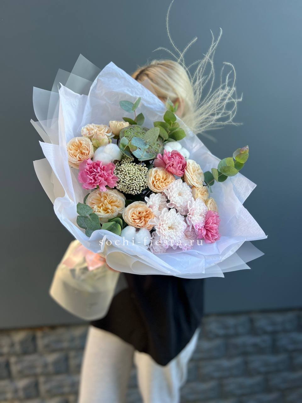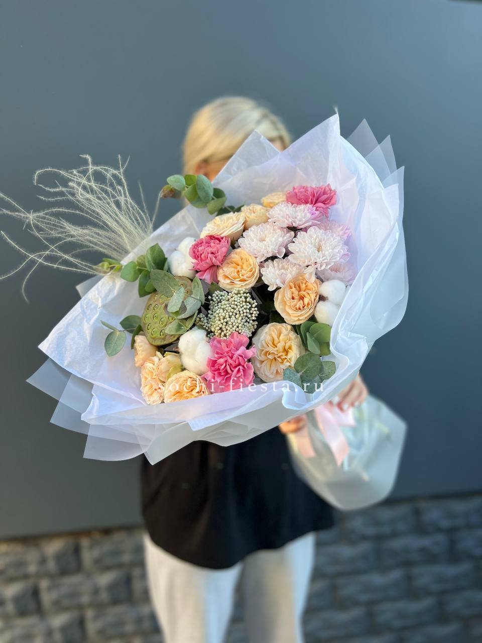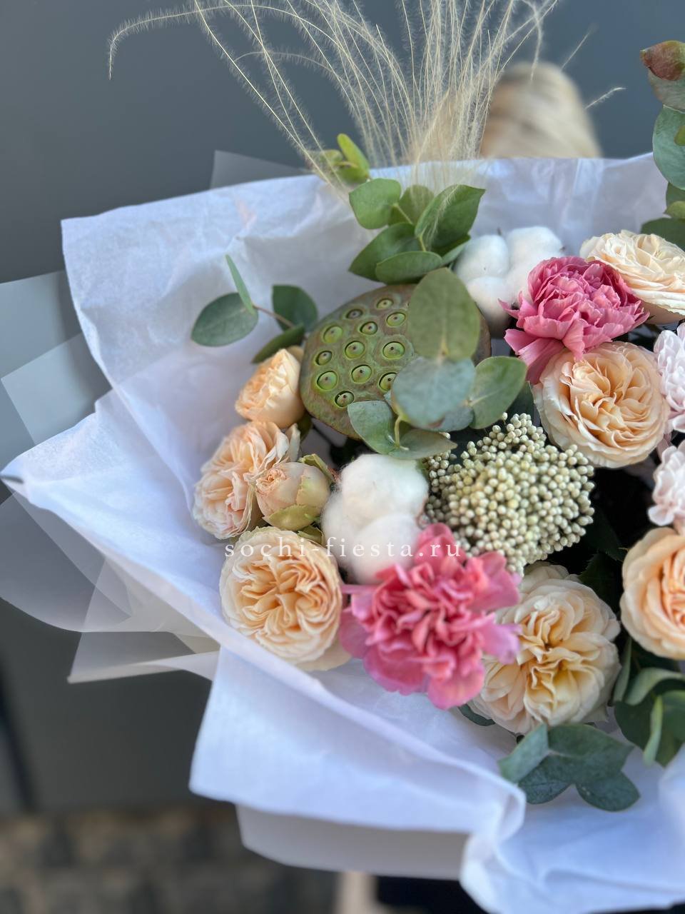 Экзотический лотос встречается с пушистым хлопком и кустовыми розами пионовидной формы. Ковыль добавляет воздушности, а озатамус создает природную текстуру. Композиция для тех, кто ценит необычные сочетания растений.