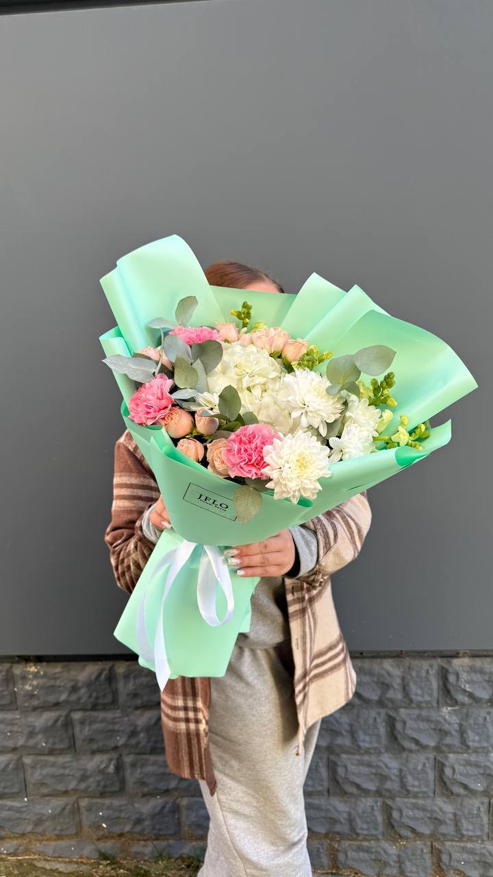 Этот пышный авторский букет в мятно-пастельных тонах — само воплощение весенней свежести и легкости.