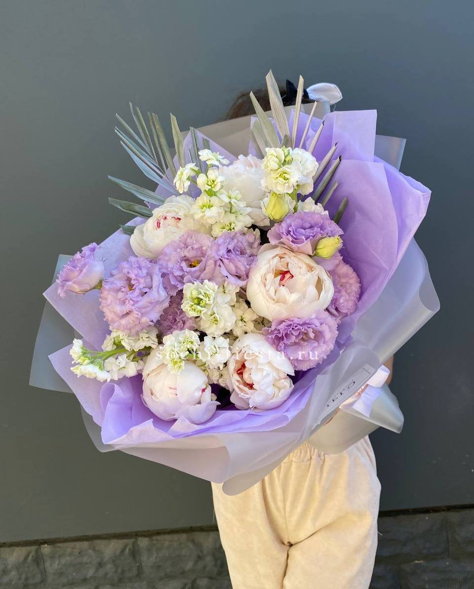 Пионы и эустома собраны в свободную форму где каждый бутон раскрывается в своём ритме. Маттиола и чико дополняют букет мягкими линиями и природной непринужденностью.