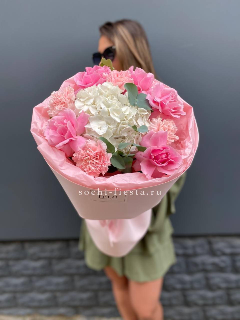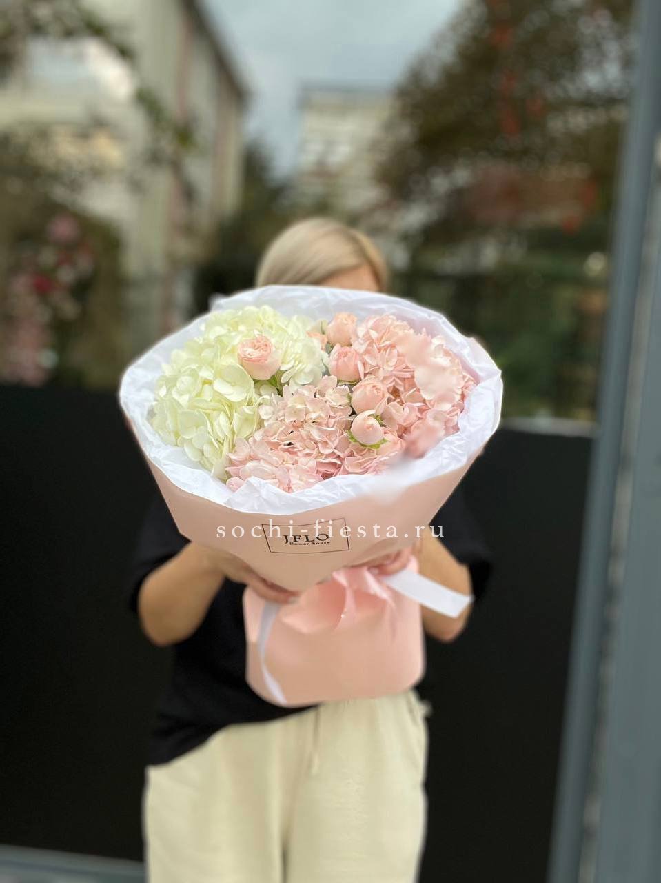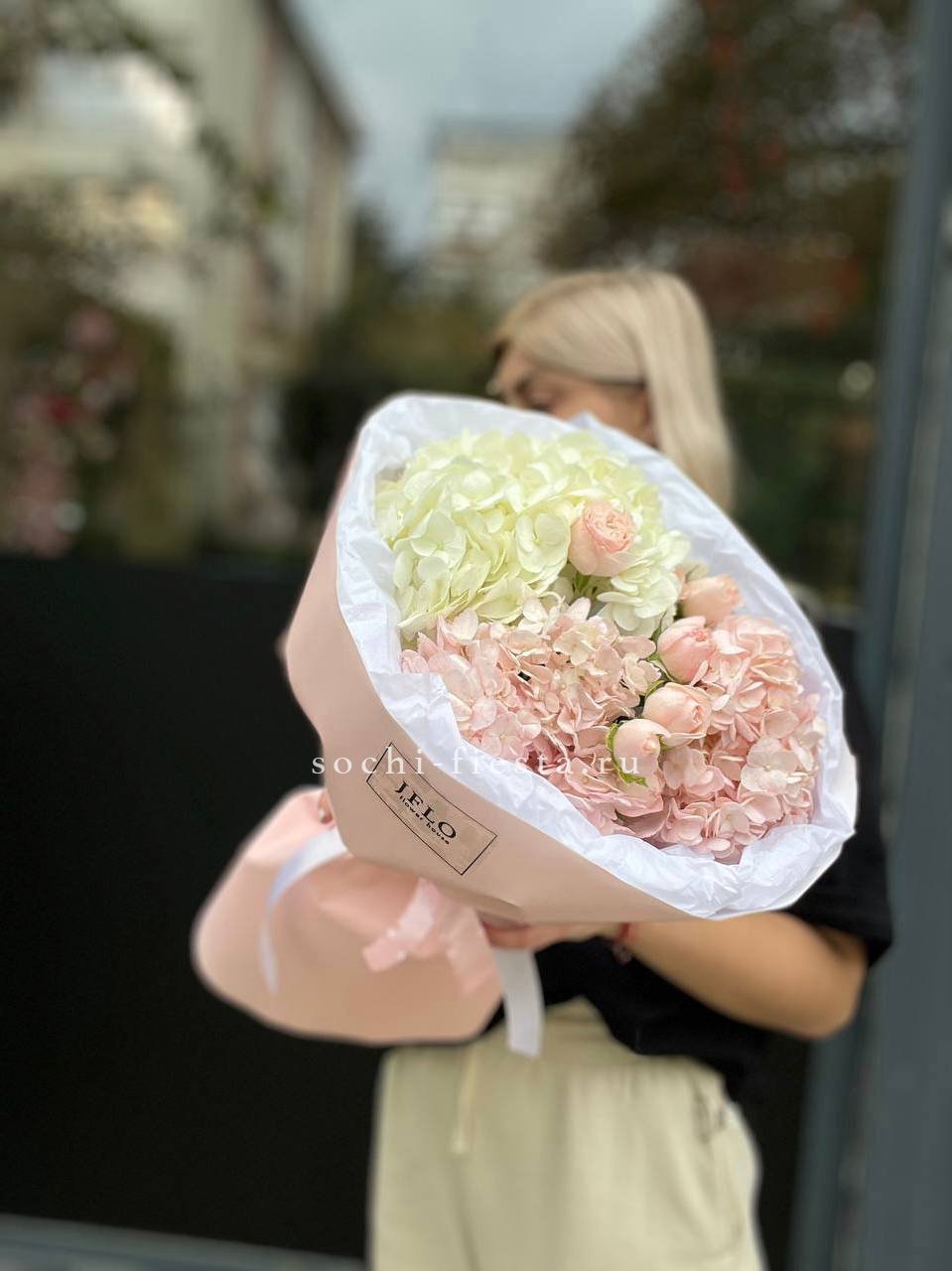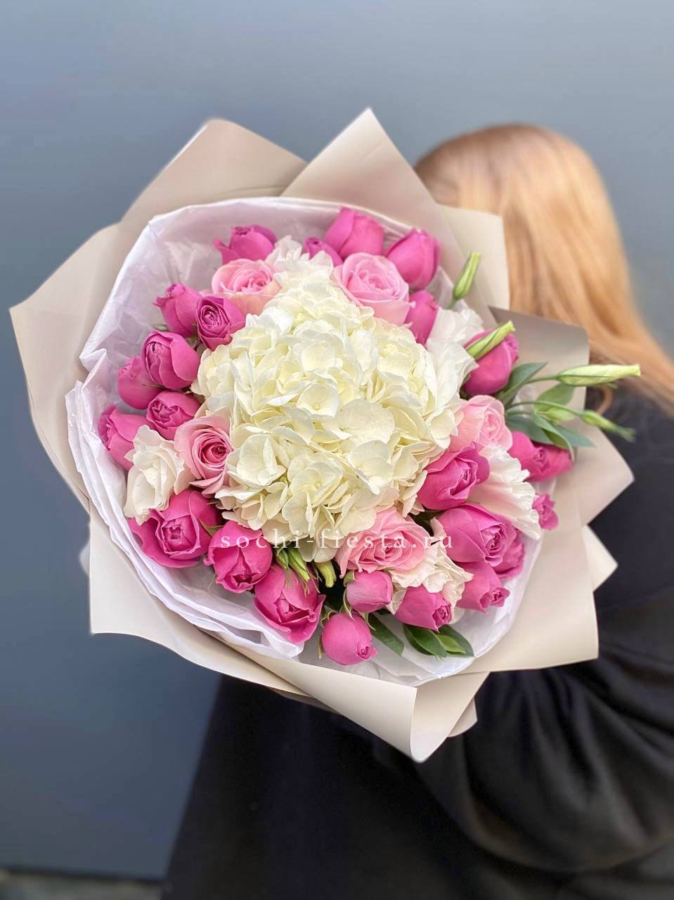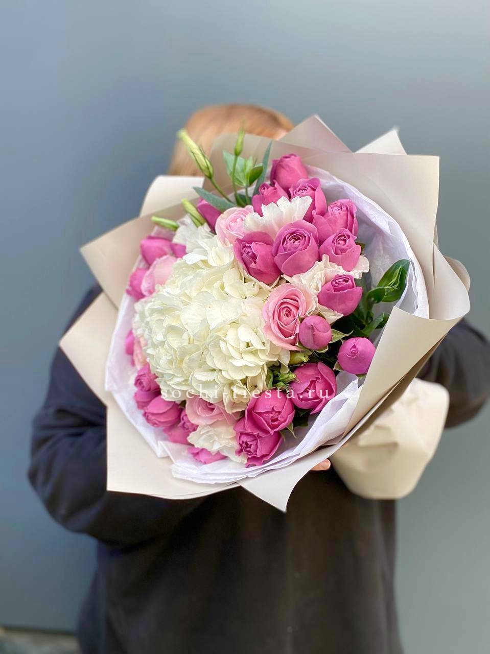 гортензия, герберы, розы, диантусы, хлопок,  авторское оформление.