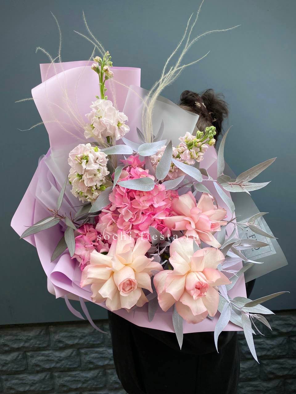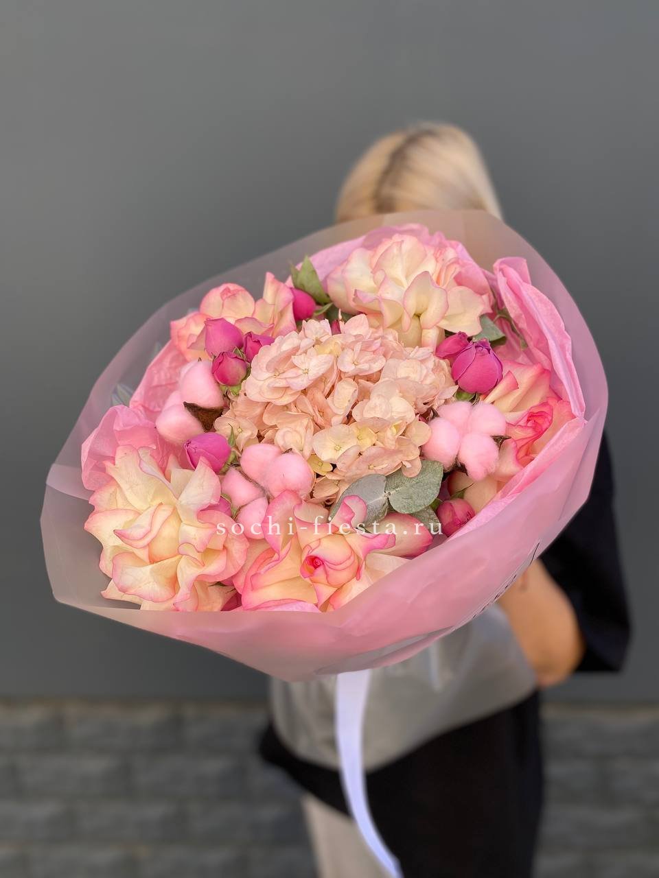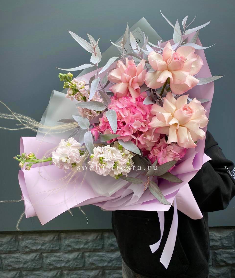 гортензия, мисти баблс, джумилия, эвкалипт, хлопок, упаковка.