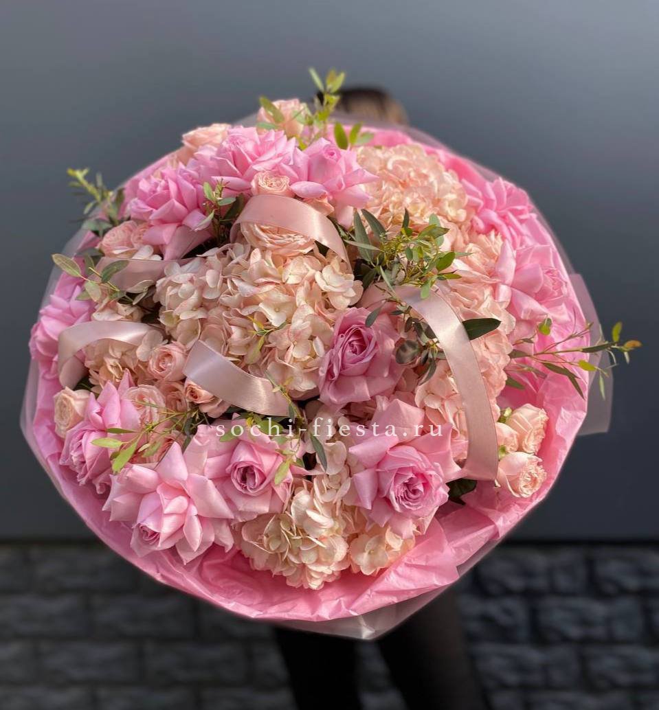 Крупные бутоны Джумилии соседствуют с воздушной гортензией и россыпью кустовых роз. Эвкалипт и хлопок создают спокойный фон для нежной палитры.