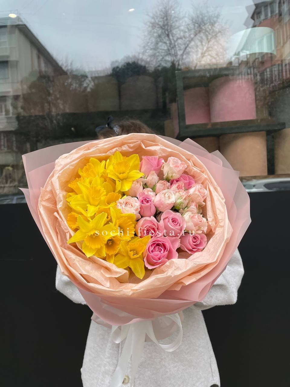 Весенние нарциссы встречаются с бархатными розами в одном букете. Пионовидные бутоны добавляют округлости, а белые и жёлтые оттенки перетекают друг в друга, создавая лёгкое цветовое движение.