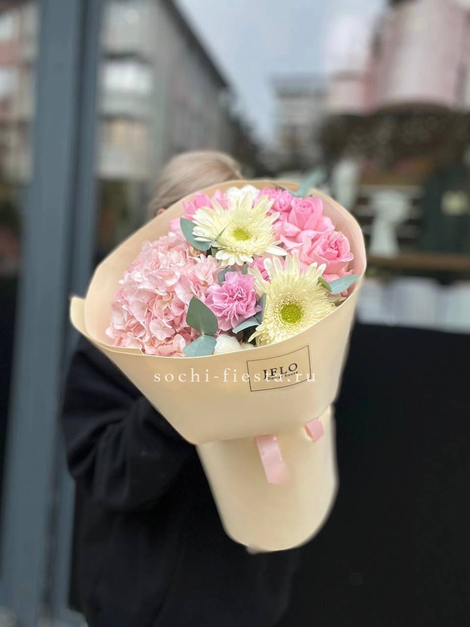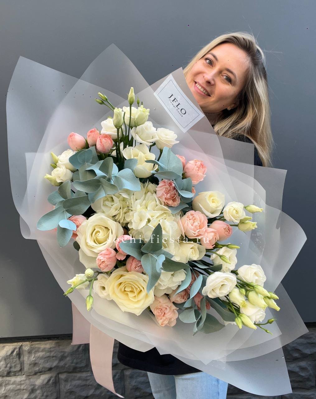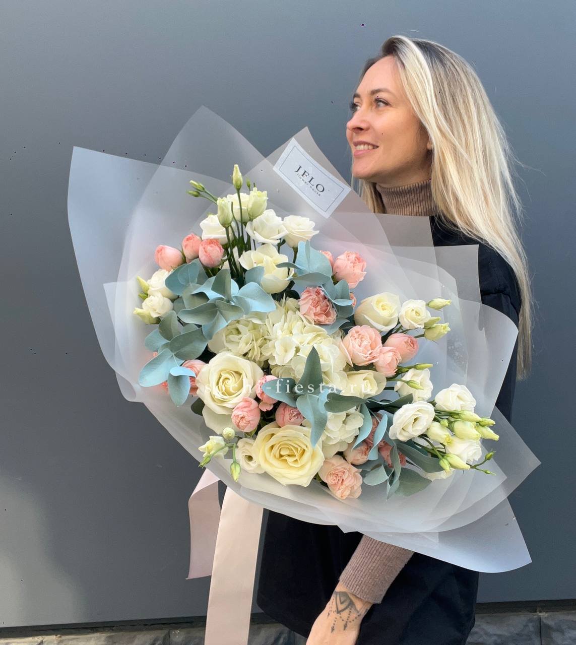 диантус, эустома, гортензия, хайди, эвкалипт, озатамус, пленка.