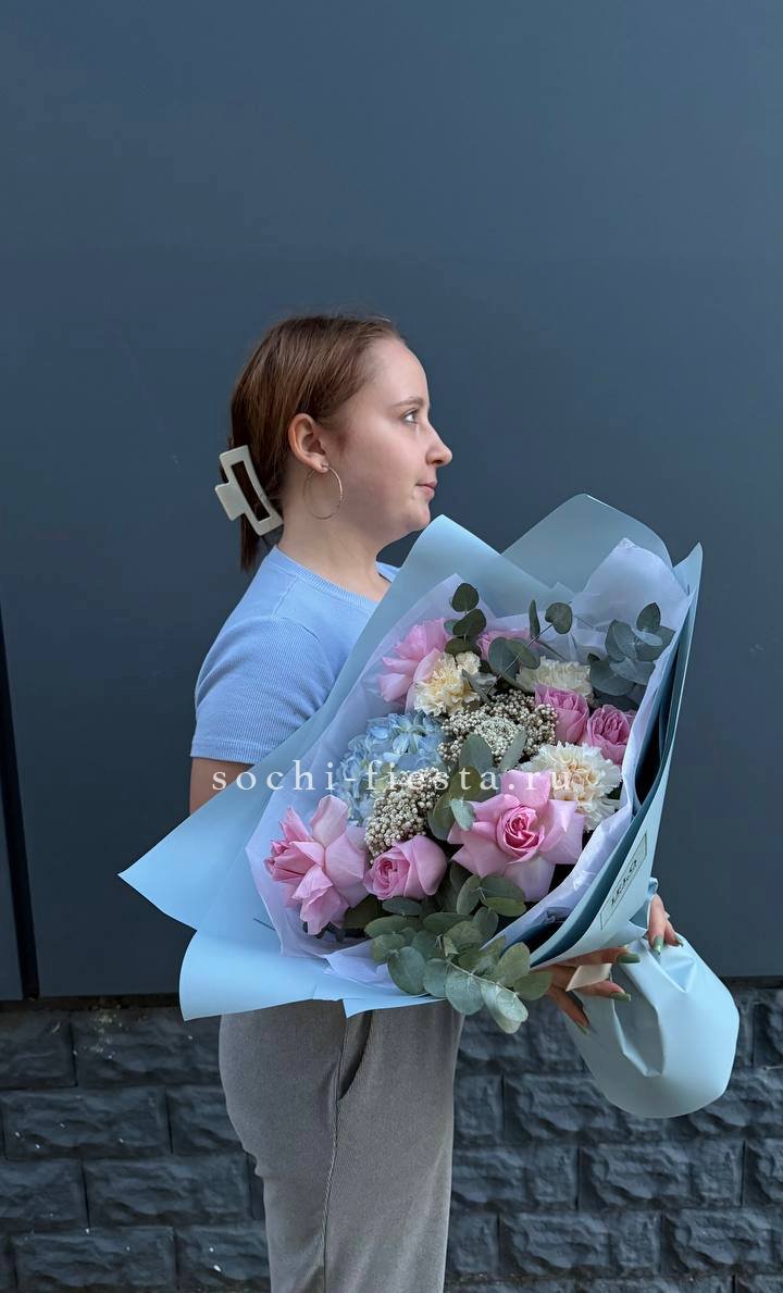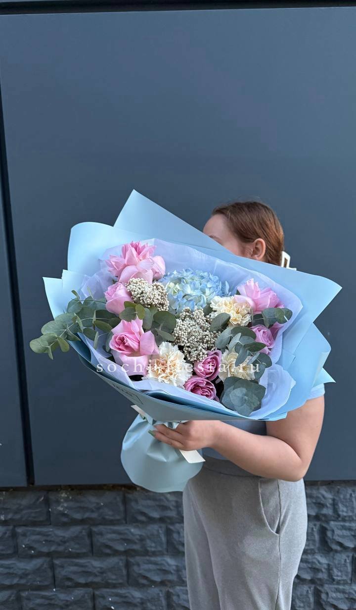 розы, гортензия, альстромерии, маттиола лента и дизайнерская пленка.