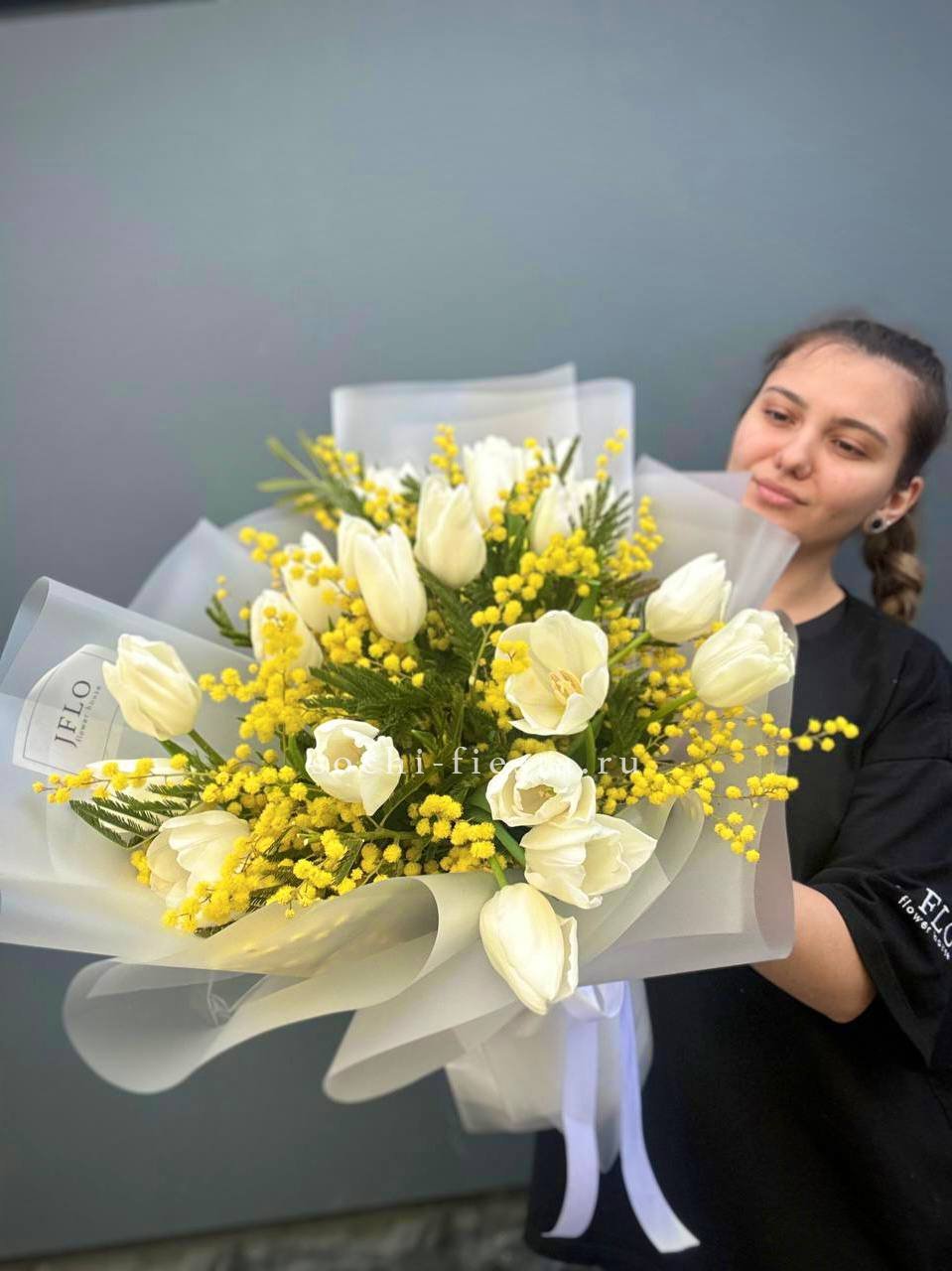 тюльпаны 25шт, мимоза, оформление.