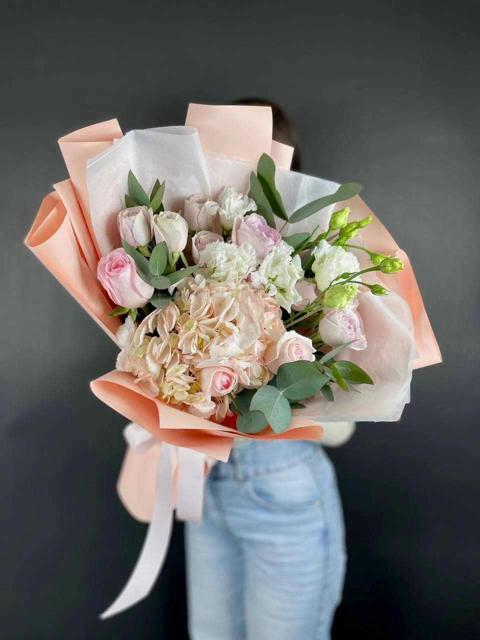 Озотамнус и диантусы вносят воздушность между классическими розами. Эвкалипт обрамляет композицию серебристыми нотами, создавая легкую структуру без лишней плотности.
