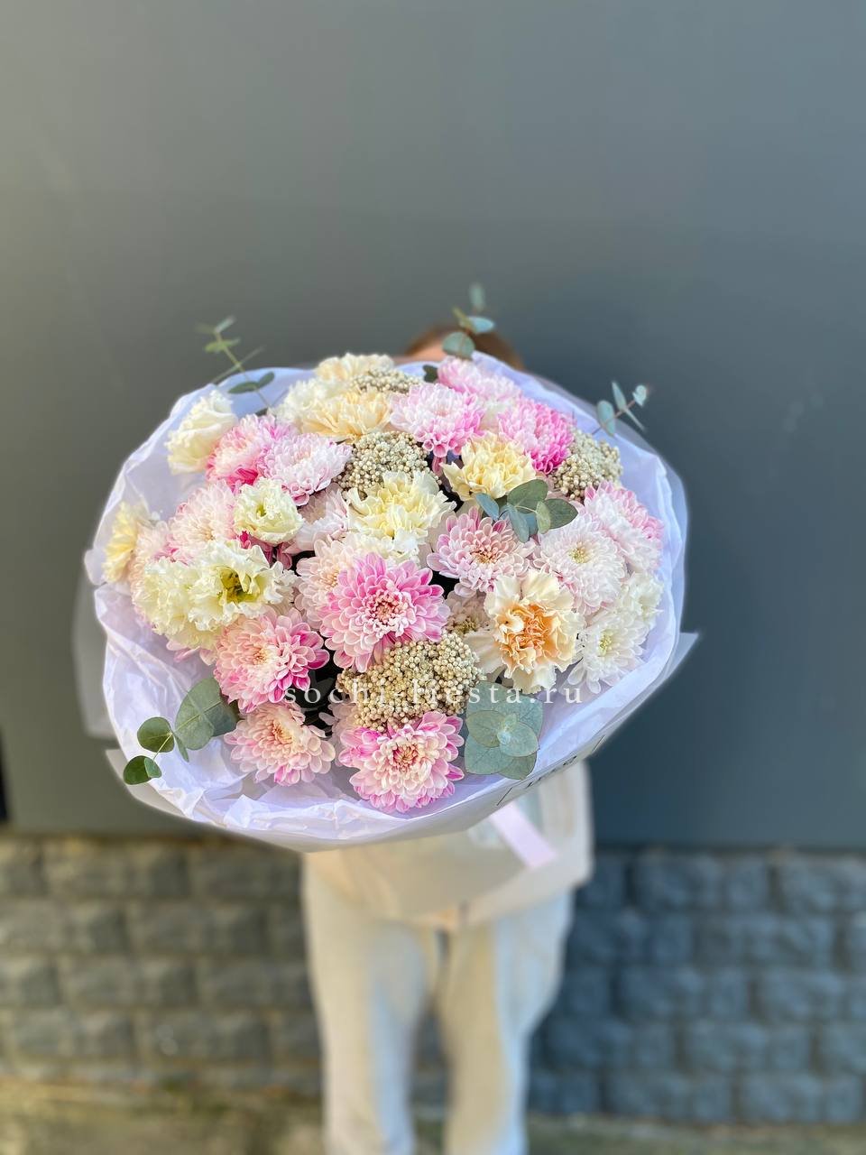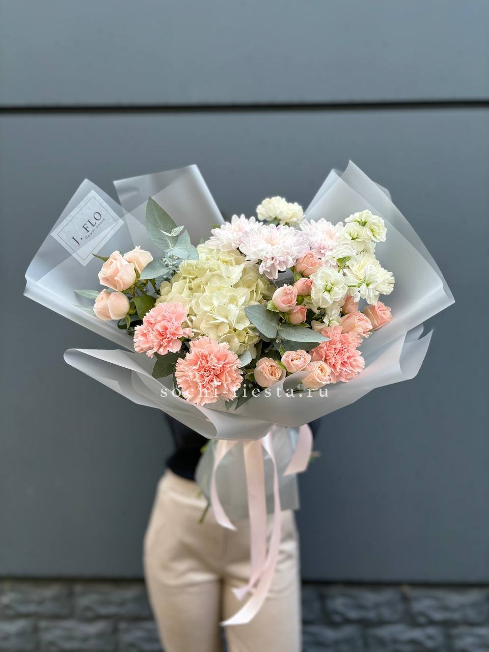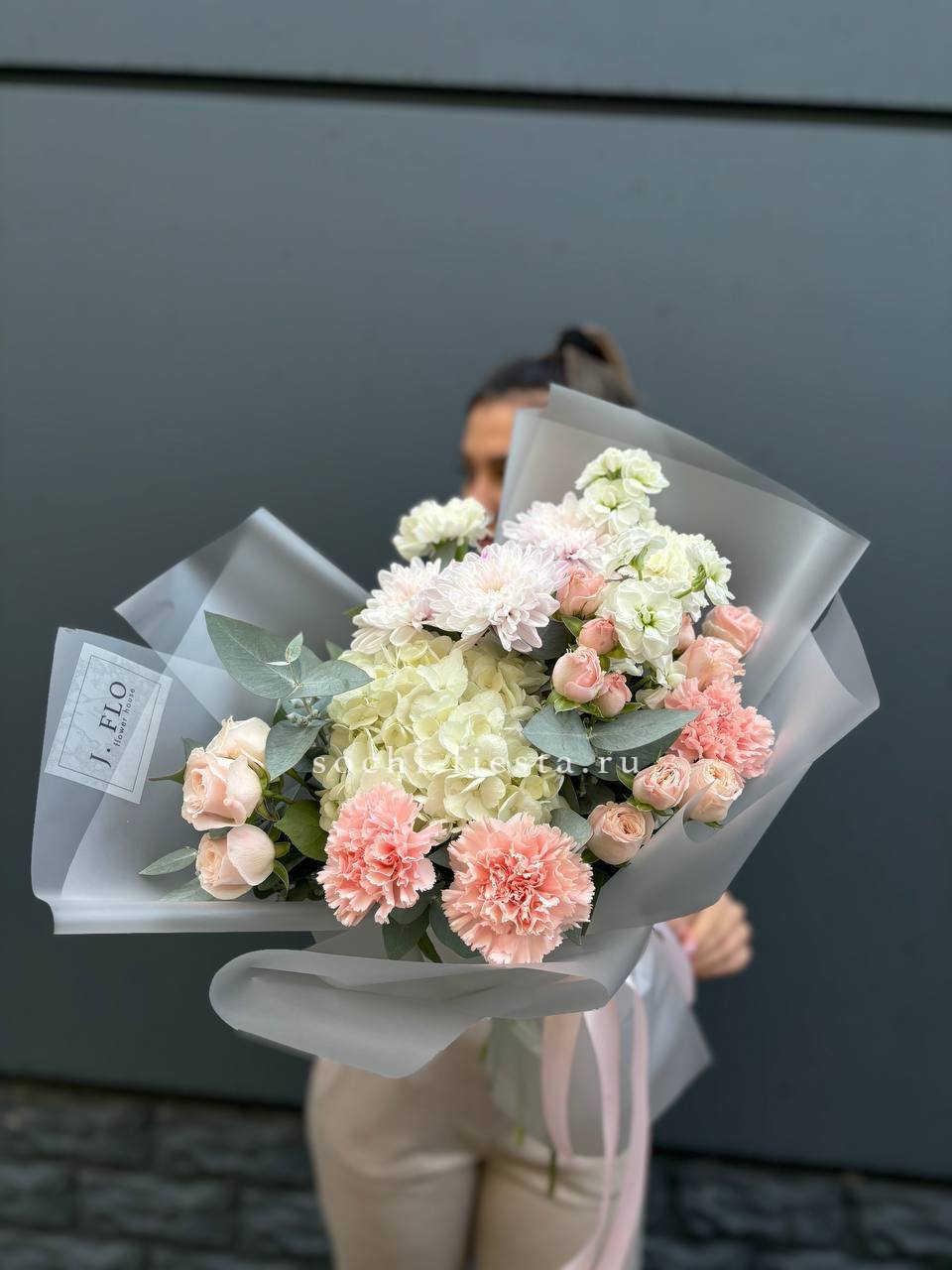 Диантусы и маттиола добавляют букету душистую лёгкость, а гортензия создаёт объёмную основу. Мисти баблс и эвкалипт рисуют воздушный контур вокруг розовых оттенков.
