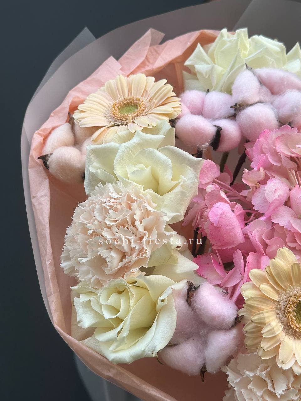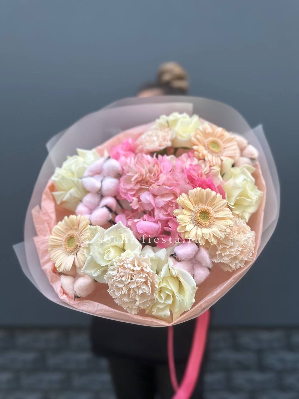 гортензия, диантус, кустовая пионовидная роза, эустома, вспомогательные цветы, эвкалипт, лента, дизайнерская упаковка.