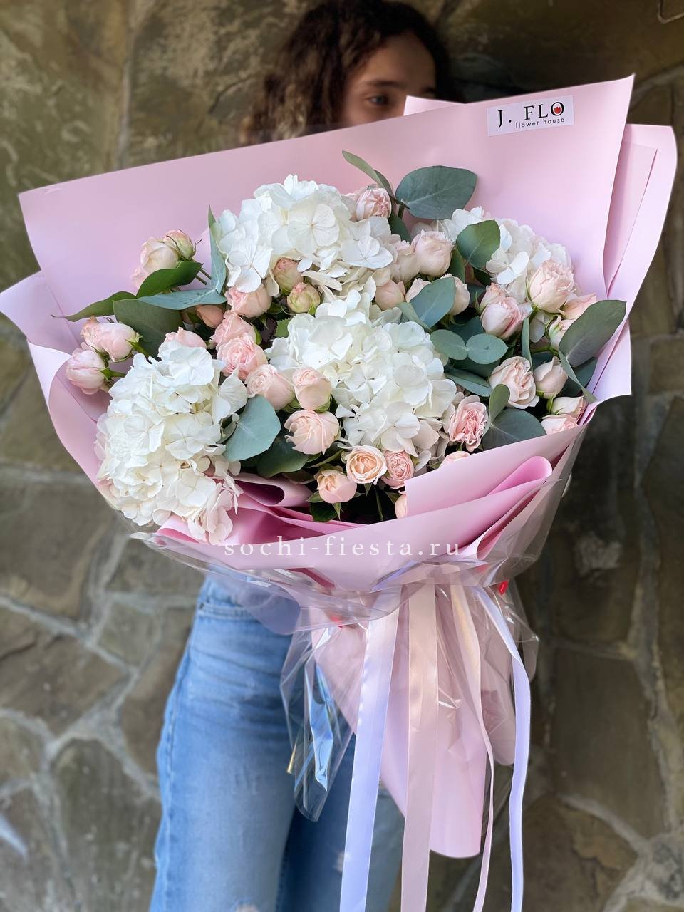 Этот пышный авторский букет напоминает нежное зефирное облако, в котором гармонично сочетаются объемные формы и изысканные оттенки. Композиция представляет собой микс из крупных соцветий гортензии и кустовых роз в пастельной гамме.
