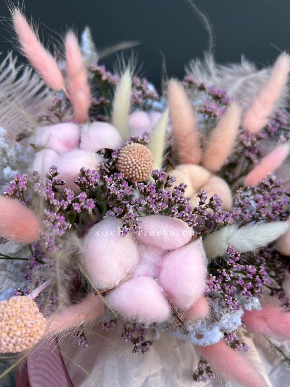 Природная палитра в одной композиции: пушистый лагурус соседствует с воздушной гипсофилой и текстурным хлопком. Вертикали ковыля и вербы задают ритм, а необычные детали добавляют характер. Готовое решение для интерьера, которое сохранит вид надолго.