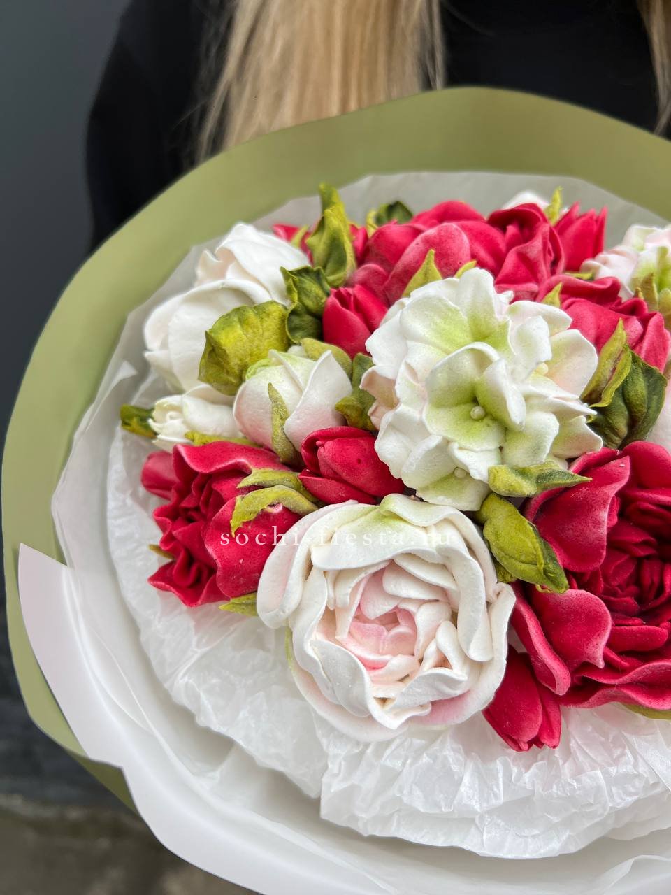 Букет из зефирных лепестков в насыщенных тонах собран на натуральных компонентах. Яркая палитра и воздушная текстура создают весёлое настроение без единого увядшего бутона.